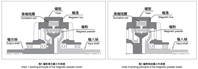 激磁線圈有電流通過時,磁軛中產(chǎn)生工作磁通,工作腔中的磁粉沿磁通方向呈鏈狀連接起來(形成磁粉鏈),磁粉離合器就是靠此時磁粉與磁粉、與工作面之間的摩擦力和磁粉鏈之間的抗剪力來傳遞轉(zhuǎn)矩,磁粉離合器處于結(jié)合狀態(tài)。(見圖1)