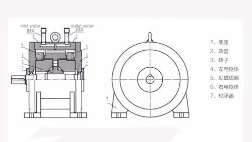 CW型電渦流制動器由轉(zhuǎn)子(帶有槽輪)、定子(包括左右電樞體、勵磁線圈、端蓋、軸承蓋)、機(jī)座組成。 2.CW電渦流制動器的工作原理 當(dāng)與轉(zhuǎn)子同軸裝配的勵磁線圈通有直流電視時,其產(chǎn)生的磁通經(jīng)電樞體、渦流環(huán)、氣隙和轉(zhuǎn)子形成磁閉合回路。由于轉(zhuǎn)子外圈面被制成均勻分布的齒和槽,故在氣隙和渦流環(huán)內(nèi)表面產(chǎn)生疏密詳見的磁場。因此,當(dāng)轉(zhuǎn)子被拖動旋轉(zhuǎn)時,在渦流環(huán)內(nèi)表面的任一點的磁場產(chǎn)生交變變化,由此感應(yīng)出,該“渦流”所形成的磁場又與原氣隙磁場相互作用,在轉(zhuǎn)子上就產(chǎn)生了制動力矩。動力機(jī)輸出的功率被轉(zhuǎn)化成渦流環(huán)上“渦流”產(chǎn)生的等值發(fā)熱量,該熱量由進(jìn)入渦流環(huán)冷卻水槽中持續(xù)不斷的冷卻水帶走。 電渦流制動器主要技術(shù)參數(shù):